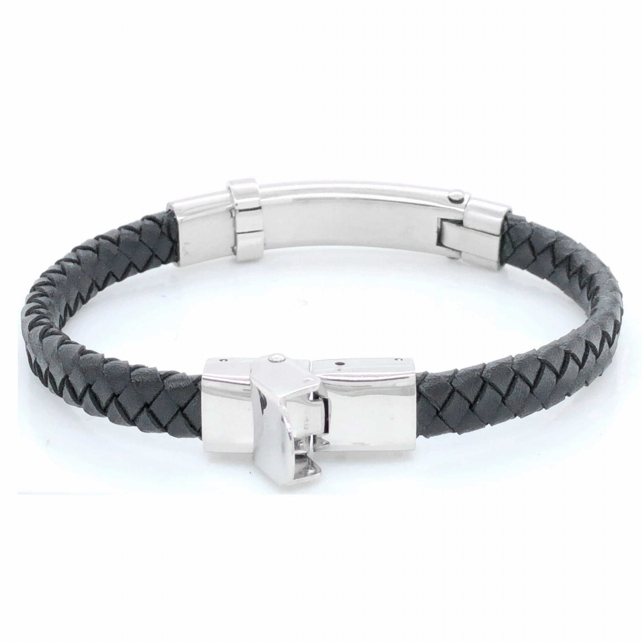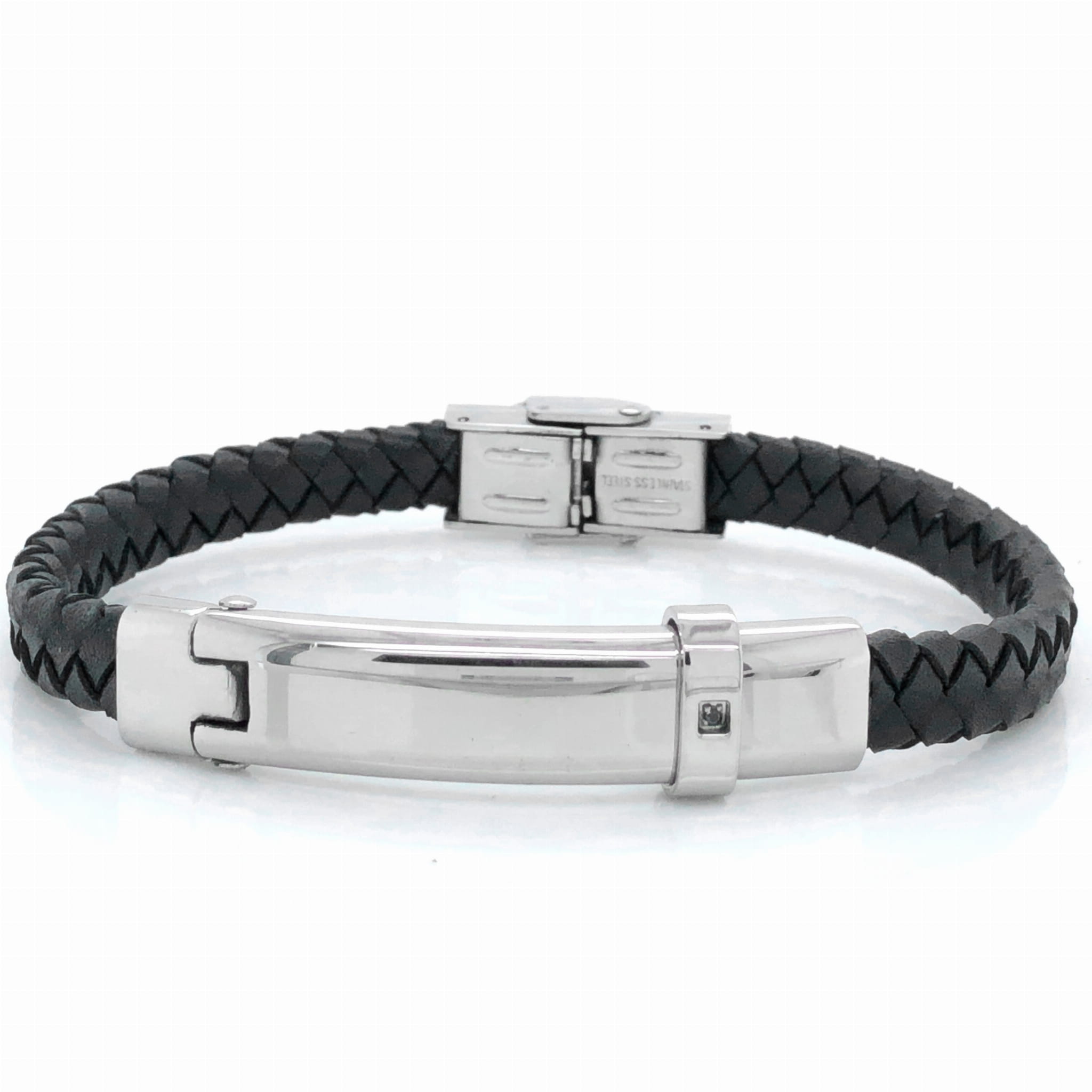 Stylowa bransoleta stalowa na czarnym pasku z eko skóry