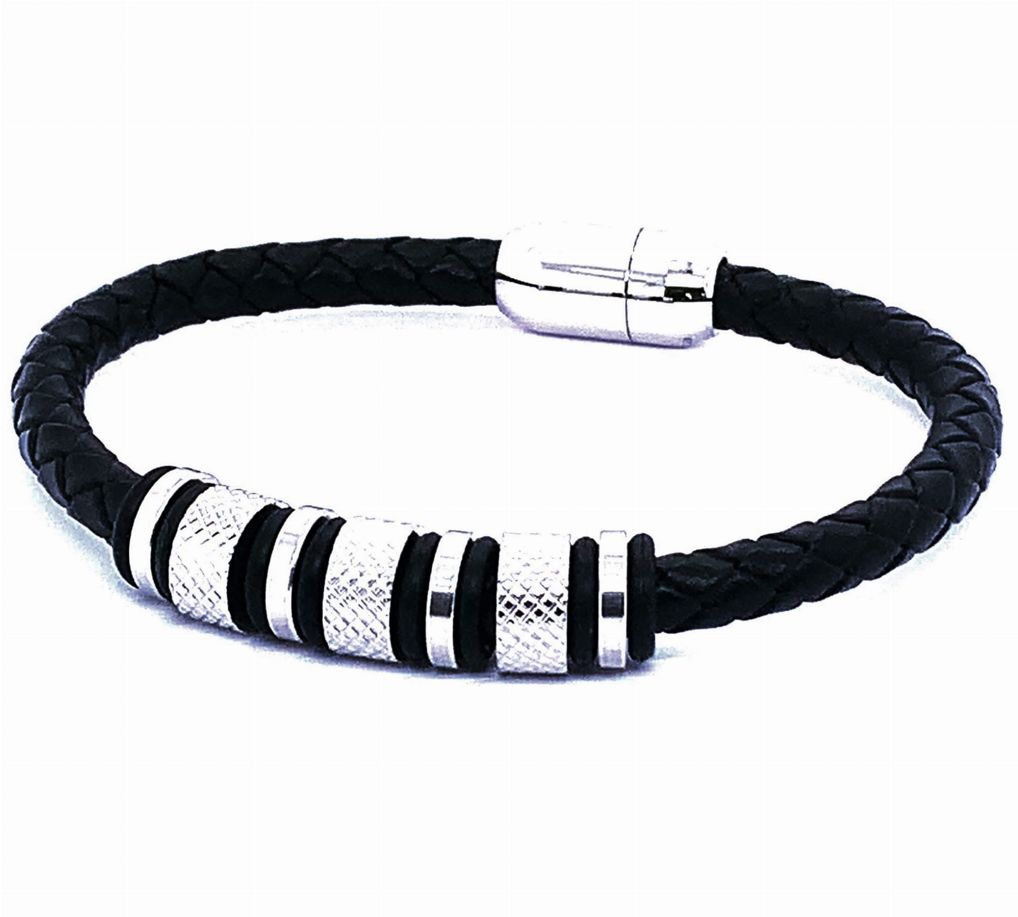 Stylowa bransoleta stalowa na czarnym, plecionym skórzanym pasku.