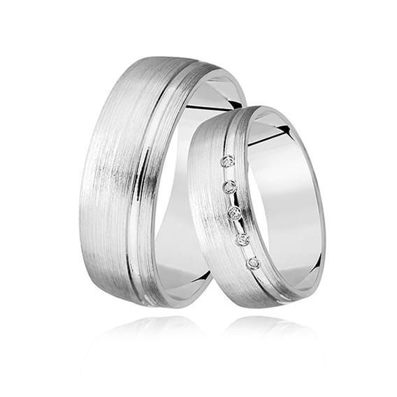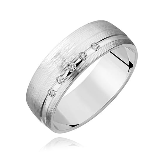 Gładka, satynowana powierzchnia obrączki nadaje jej wyjątkowy charakter, tworząc delikatny matowy efekt, który przyciąga uwagę swoją subtelnością. Dodatkową ozdobą są białe, iskrzące cyrkonie, które zostały umieszczone równomiernie na obrączce, dodając jej delikatnego blasku i elegancji.